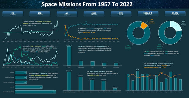 Infusing my Passion for Space and Astronomy, my Excel project provides a meticulously curated report that unveils the captivating narrative of space missions spanning the years 1957 to 2022.This project has been built using an expansive dataset, meticulously encompassing the entire spectrum of space missions, a foundational cornerstone that allows for insightful exploration.