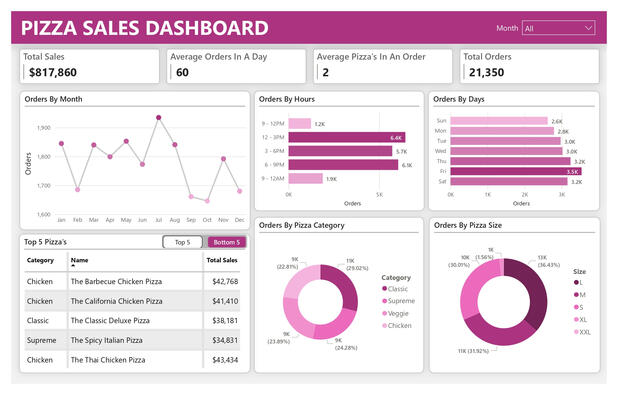 In analyzing the pizza sales data, several key insights emerge.On average, the company receives 60 orders per day, with peak hours observed between 12 pm and 9 pm. The months of July and August see the highest sales, aligning with the peak days of Thursday, Friday, and Saturday. Most orders consist of an average of 2 pizzas.Among the pizzas offered, the best-sellers include barbeque chicken pizza, California chicken pizza, classic deluxe pizza, spicy Italian pizza, and Thai chicken pizza. Conversely, the least popular pizzas are spinach pesto pizza, mediterranean pizza, spinach supreme pizza, green garden pizza, and brie carre pizza.In total, the sales revenue amounts to an impressive $817,860.